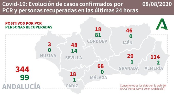 Por provincias: en Almería (46 hospitalizaciones, de los que 9 en UCI), Cádiz (9 hospitalizaciones, de los que 2 en UCI), Córdoba (9 hospitalizaciones, de los que 1 en UCI), Granada (10 hospitalizaciones, de los que 1 en UCI), Huelva (3 hospitalizaciones, de los que 1 en UCI), Jaén (5 hospitalizaciones y ninguno en UCI), Málaga (16 hospitalizaciones, de los que 2 en UCI) y Sevilla (7 hospitalizaciones y ninguno en UCI).