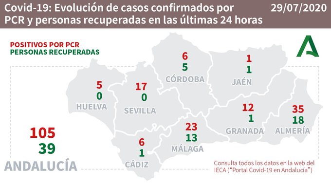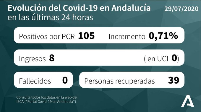 Por provincias: en Almería (18 hospitalizaciones de los que 3 en UCI), Cádiz (4 hospitalizaciones y ninguno en UCI), Córdoba (8 hospitalizaciones de los que 2 en UCI), Granada (9 hospitalizaciones y ninguno en UCI), Huelva (sin hospitalizaciones), Jaén (1 hospitalizaciones y ninguno en UCI), Málaga (9 hospitalizaciones y ninguno en UCI) y Sevilla (3 hospitalizaciones de los que 2 en UCI).