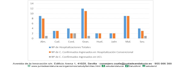 Por provincias: en Almería (9 hospitalizaciones de los que 1 en UCI), Cádiz (3 hospitalizaciones y ninguno en UCI), Córdoba (4 hospitalizaciones de los que 2 en UCI), Granada (12 hospitalizaciones de los que 1 en UCI), Huelva (2 hospitalizaciones y ninguno en UCI), Jaén (2 hospitalizaciones y ninguno en UCI), Málaga (9 hospitalizaciones y ninguno en UCI) y Sevilla (4 hospitalizaciones de los que 1 en UCI).