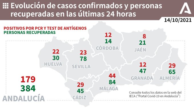 Por provincias: en Almería (20 hospitalizaciones, de las que 11 en UCI), Cádiz (13 hospitalizaciones, de las que 6 en UCI), Córdoba (16 hospitalizaciones, de las que 4 en UCI), Granada (20 hospitalizaciones, de las que 3 en UCI), Huelva (13 hospitalizaciones, de las que 4 en UCI), Jaén (11 hospitalizaciones y ninguno en UCI), Málaga (74 hospitalizaciones, de las que 14 en UCI) y Sevilla (43 hospitalizaciones, de las que 13 en UCI).