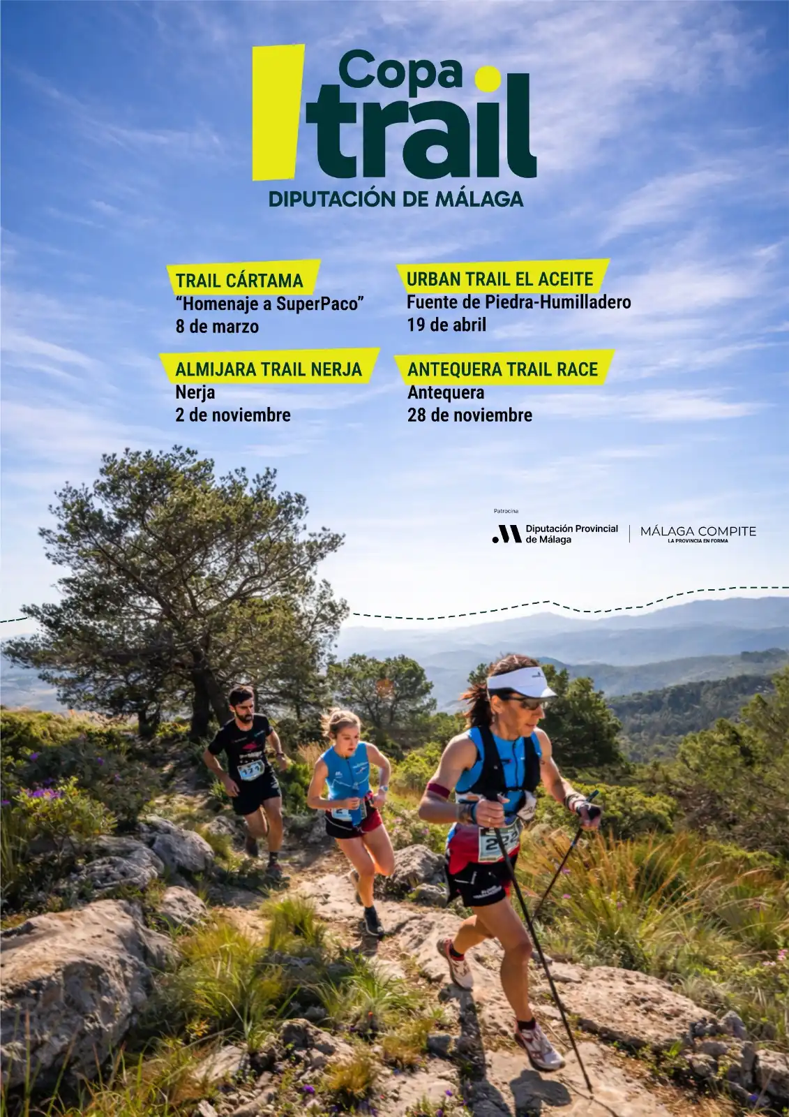 La Copa arrancó el 8 de marzo con el Trail Cártama ‘Homenaje a Superpaco’, y continúa el 19 de abril con el Urban Trail El Aceite en Fuente de Piedra y Humilladero; Almijara Trail Nerja el 2 de noviembre, y Antequera Trail Race el 28 de noviembre