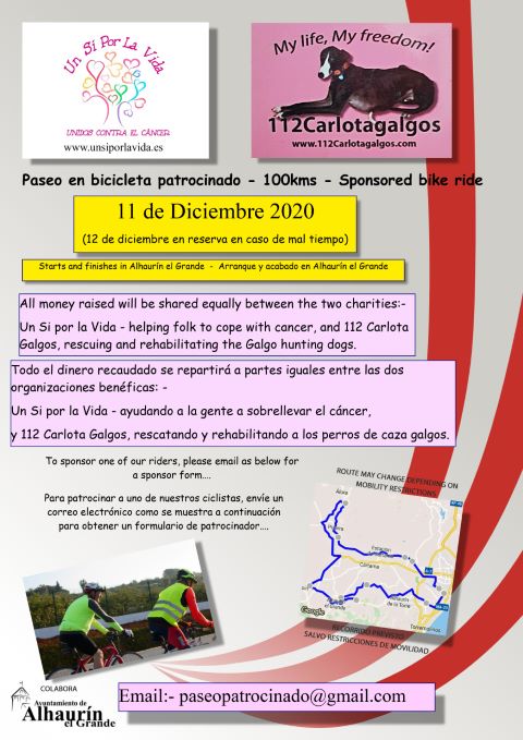 Este viernes 11 de diciembre, dos aficionados a este deporte que suman 134 años completarán un recorrido sobre sus bicicletas de 100 kilómetros. Son John Staton (61) y Ray Bowers (73), los protagonistas de este proyecto que nunca antes se había celebrado en Alhaurín el Grande y con el que pretenden recaudar fondos para ambas asociaciones. El Ayuntamiento de Alhaurín el Grande colabora con la actividad.