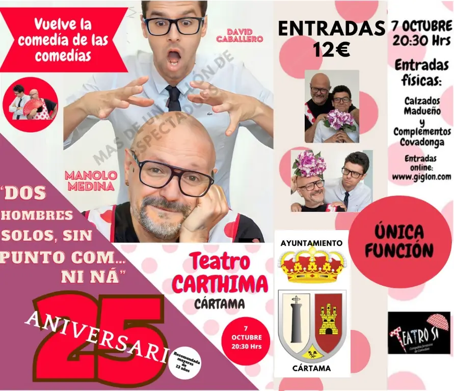 Manolo Medina y David Caballero se subirán este sábado, 7 de octubre, a las tablas del Teatro Municipal Carthima para celebrar el 25 aniversario de la comedia de éxito nacional ‘Dos hombres solos sin punto como ni ná’. Habrá una única función las 20.30 horas.
