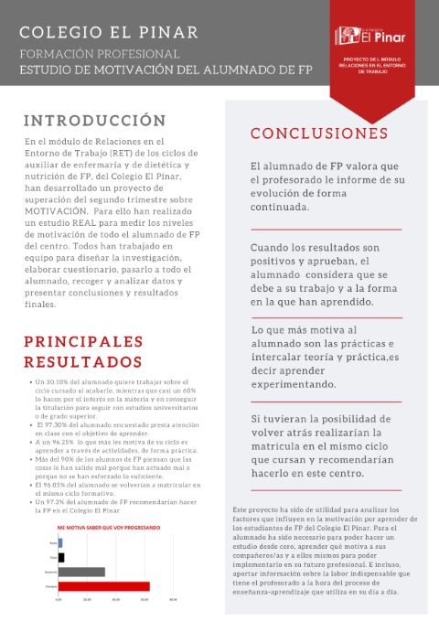 Como afirma la docente titular del módulo temático RET en sus conclusiones, “el proyecto ha sido de utilidad para analizar los factores que influyen en la motivación por aprender de los estudiantes de FP. Para el alumnado ha sido necesario para poder hacer un estudio desde cero, aprender qué motiva a sus compañeros/as y a ellos mismos para poder implementarlo en su futuro profesional. E incluso, aportar información sobre la labor indispensable que tiene el profesorado a la hora del proceso de enseñanza-aprendizaje que utiliza en su día a día”, confirma Vicen Ruiz; quien mostró su satisfacción por la iniciativa del alumnado. De la misma forma, es importante resaltar que el estudio se ha desarrollado de forma completamente anónima para garantizar la imparcialidad de las respuestas; preservando con ello el rigor y la objetividad de los datos estadísticos obtenidos.