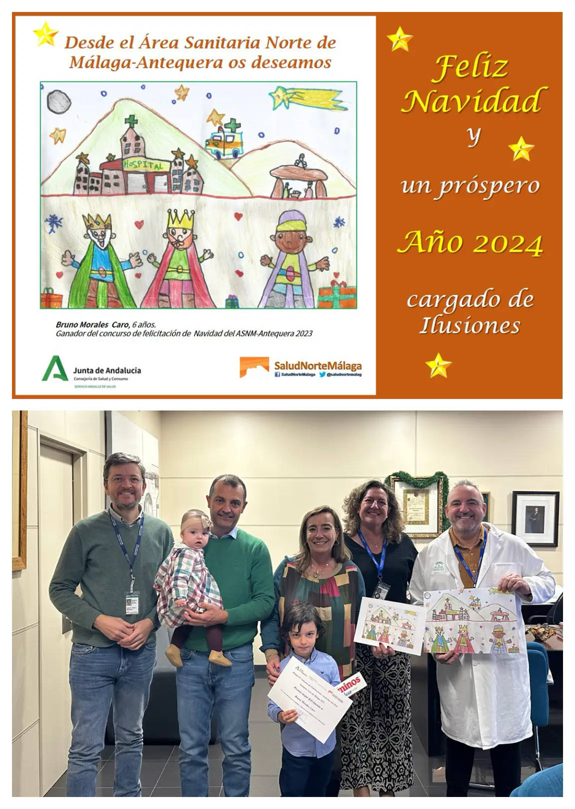 Bruno Morales Caro, alumno de primer curso de Educación Primaria del Colegio Nuestra Señora del Carmen de Antequera, acompañado de su padre y hermana, han recibido las felicitaciones del equipo directivo del centro junto con un obsequio educativo para agradecer su esfuerzo y participación. La obra de Bruno conformará la que ya es la felicitación navideña oficial del Área Sanitaria Norte de Málaga–Antequera en el presente periodo.