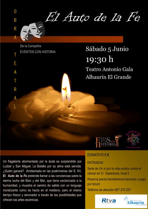 SINOPSIS: Un flagelante atormentado por la duda es sorprendido por Luzbel y San Miguel. La Batalla por su alma está servida. ¿Quién ganará? Ambientada en las postrimerías del siglo XV, El Auto de la Fe pretende llamar a las conciencias sobre la eterna lucha del Bien y del Mal, que tiene esclavizada a la humanidad, y muestra el camino de salida con un lenguaje moralizante, como se hacía en el medievo, pero al mismo tiempo fresco y renovador a través de las posibilidades que ofrecen las artes escénicas.