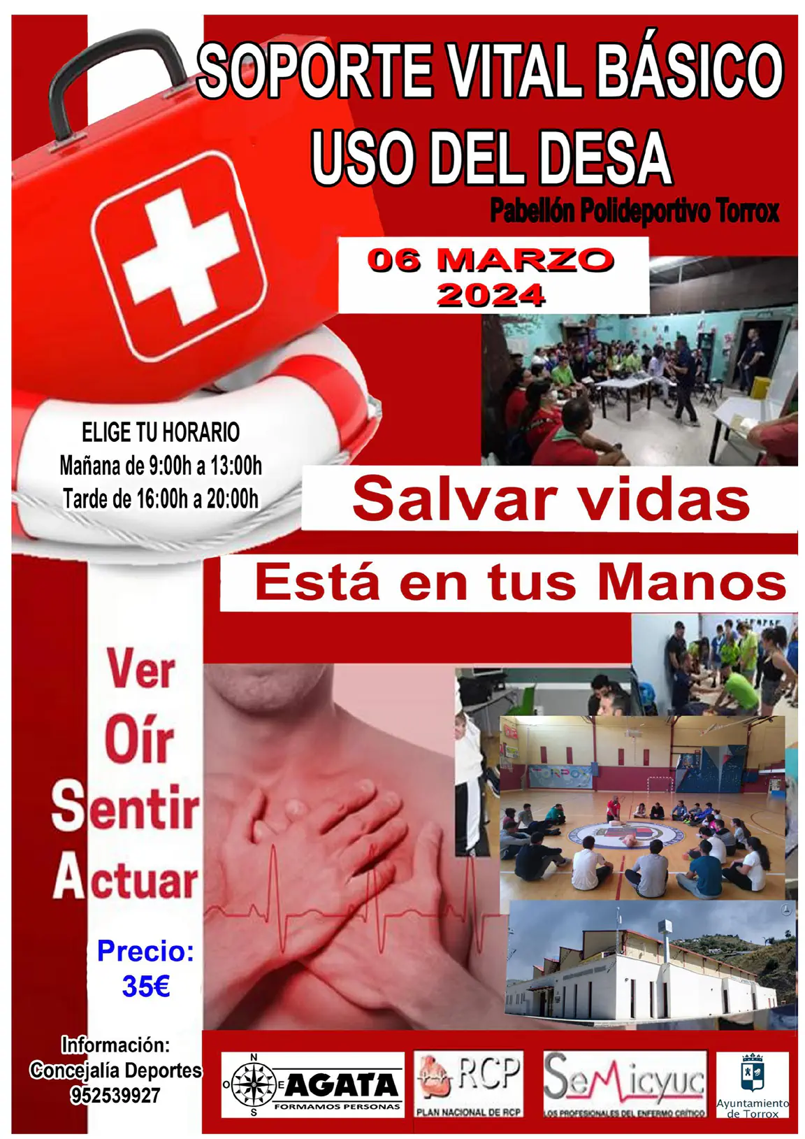 El Ayuntamiento de Torrox ha organizado un curso de soporte vital básico sobre el uso del Desfibrilador Externo Semiautomático (DESA) dirigido a funcionarios y ciudadanos en general que tendrá lugar el próximo miércoles 6 de marzo en el pabellón del complejo deportivo de La Granja. El concejal de Deportes, José Manuel Fernández, y Rafael Rico, en representación de la empresa local Ágata Formación, han presentado este curso cuyo lema es «salvar vidas está en tu mano».