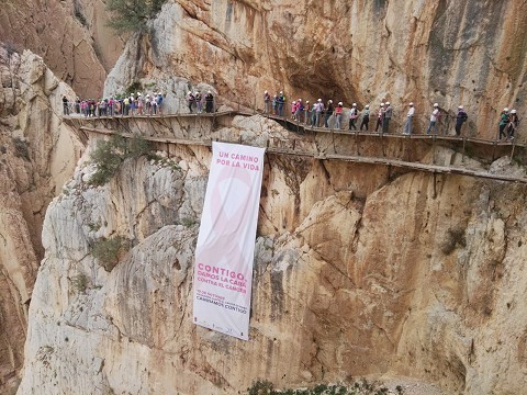 El Caminito del Rey conmemora hoy sábado, 19 de octubre, el Día Internacional contra el Cáncer de Mama, desplegando una gran pancarta en el recorrido y destinando la recaudación a la Asociación Española Contra el Cáncer en Málaga.