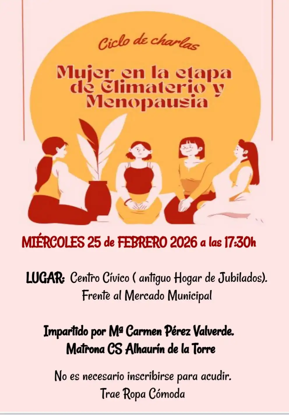 El Centro Cívico ‘La Torre’ de Alhaurín de la Torre será escenario el próximo miércoles 25 de febrero de 2026, a las 17:30 horas, de la charla titulada “Mujer en la etapa de Climaterio y Menopausia”, una iniciativa enmarcada dentro de un ciclo de encuentros informativos dirigidos a la ciudadanía.