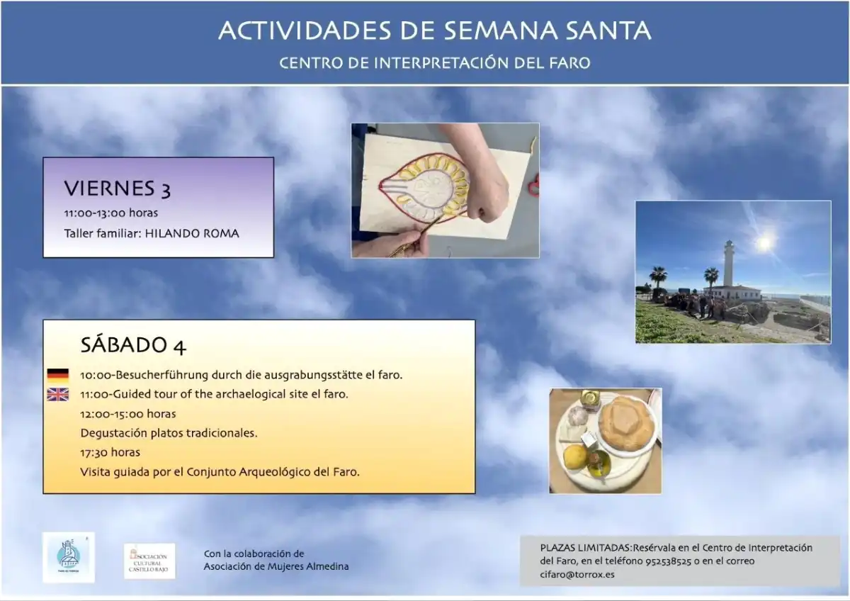 En concreto, el viernes 3 de abril, entre las 11:00 y las 13:00 horas, se desarrollará el taller dirigido a familias “Hilando Roma”. El sábado 4 a las 10:00 y a las 11:00 horas tendrán lugar las visitas guiadas en alemán e inglés, respectivamente, al yacimiento romano del faro. Por otro lado, de 12:00 a 15:00 horas se celebrará la degustación de platos tradicionales con la colaboración de la asociación de mujeres Almedina. Las actividades culminarán a las 17:30 horas del mismo sábado con la visita guiada en castellano al conjunto arqueológico. En todos los casos las plazas son limitadas, y es preciso reservar en el propio Centro de Interpretación del Faro, en el teléfono 952538525 o en el correo cifaro@torrox.es.