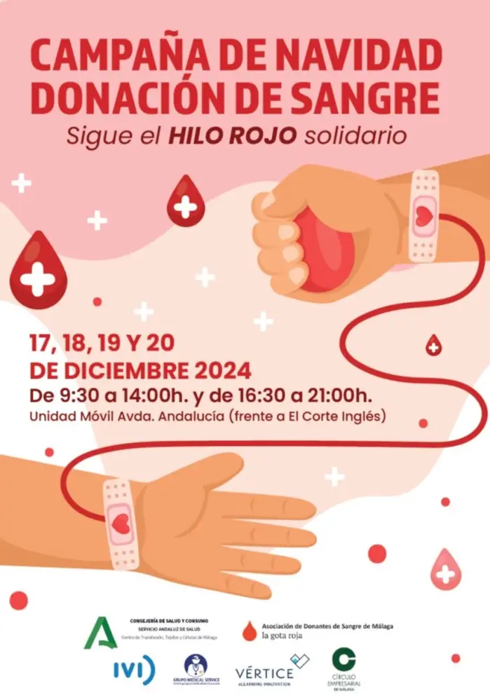 El Centro de Transfusión, Tejidos y Células de Málaga en colaboración con la Asociación de Donantes de Sangre “La Gota Roja”, celebra su ya tradicional Campaña Especial de Navidad, que tiene como objetivo facilitar las donaciones de sangre acercando la unidad móvil al centro de Málaga. Así, durante los días 17, 18, 19 y 20 de diciembre, dicha unidad móvil se encontrará ubicada en la Avenida de Andalucía frente a El Corte Inglés, y estará operativa en horario de 9,30 a 14:00 y 16,30 a 21:00.