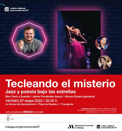 El Centro del 27 de la Diputación de Málaga ha programado para esta semana dos nuevas citas en la provincia de su ciclo ‘Tecleando el misterio. Jazz y poesía bajo las estrellas’. Mañana jueves, 26 de mayo, la poeta Carmen López y la contrabajista y cantante Blanca Barranco estarán en la Biblioteca Antonio Garrido Moraga de Vélez-Málaga acompañadas por una banda de jazz, y el viernes 27 el ciclo se trasladará a la azotea del Ayuntamiento de Fuengirola, donde el poeta Ben Clark y la cantante Suzette Montcrieff ofrecerán un espectáculo poético-musical con el acompañamiento de un dúo jazzístico.