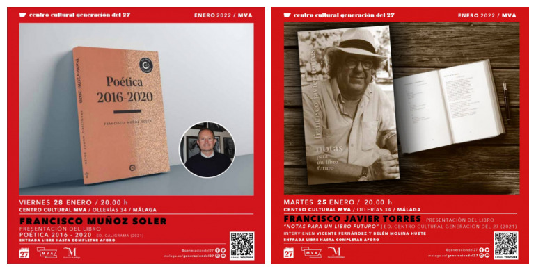 El Centro Cultural Generación del 27 continúa desarrollando su labor editorial y de apoyo a los escritores malagueños. Esta semana serán dos las novedades literarias que se presentarán en el salón de actos del Centro Cultural MVA. Mañana martes, 25 de enero, el poeta antequerano Francisco Javier Torres presentará ‘Notas para un libro futuro’, editado por el Centro del 27 y que recoge toda su obra publicada y otros textos que mantenía inéditos. Y el viernes 28 de enero, el también malagueño Francisco Muñoz Soler presentará ‘Poética 2016-2020’, editada por Caligrama en 2021 y que agrupa varios de sus poemarios.