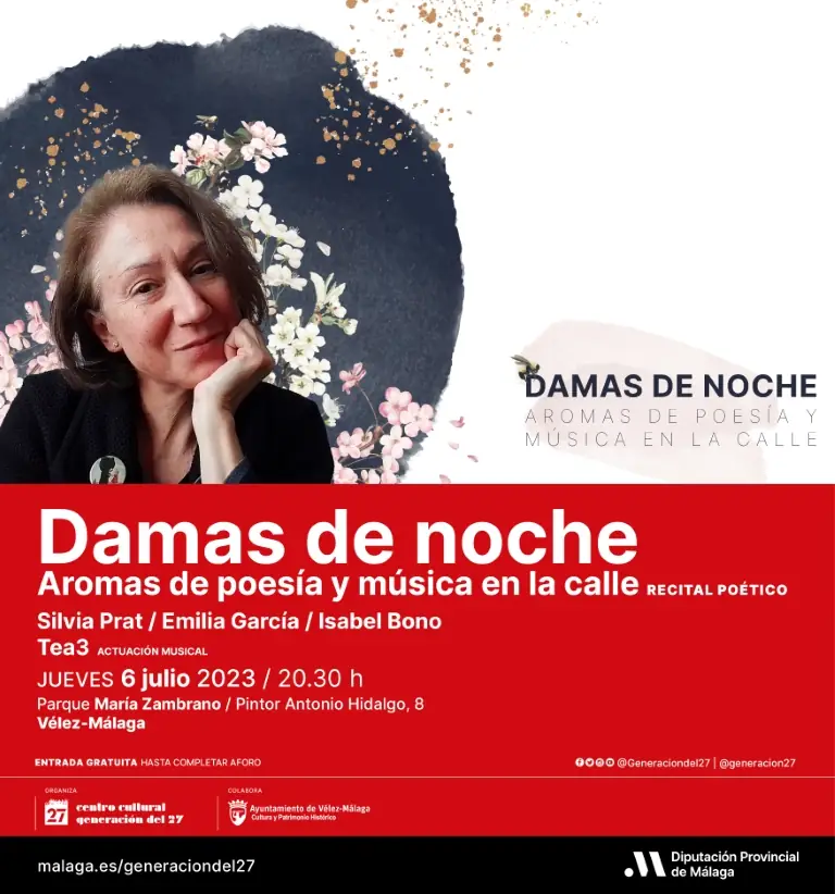 El centro cultural Generación del 27 de la Diputación de Málaga ha programado una nueva cita con la poesía en el municipio de Vélez-Málaga. Será el jueves 6 de julio con el recital poético a cargo de Isabel Bono, junto a las poetas locales Silvia Prat y Emilia García. Además, estarán acompañados por la actuación musical de del grupo Tea3. La cita, de entrada libre hasta completar aforo, tendrá lugar en el Parque María Zambrano del municipio (calle Pintor Antonio Hidalgo, 8. Vélez-Málaga) a partir de las 20:30 horas.
