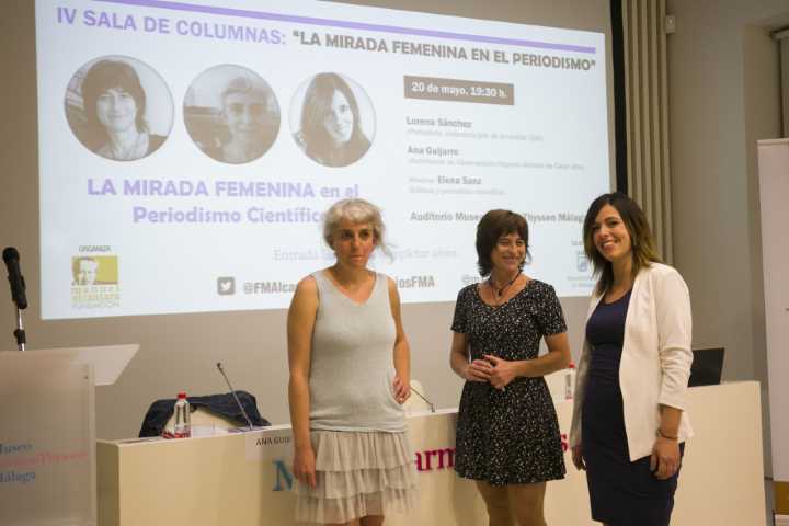 Las periodistas Lorena Sánchez y Elena Sanz, y la astrónoma Ana Guijarro han participado este lunes en la mesa de debate ‘La mirada femenina en el periodismo científico’, celebrada en auditorio del Museo Carmen Thyssen Málaga dentro del ciclo ‘Sala de Columnas’ que organiza la Fundación Manuel Alcántara en colaboración con el Ayuntamiento de Málaga.