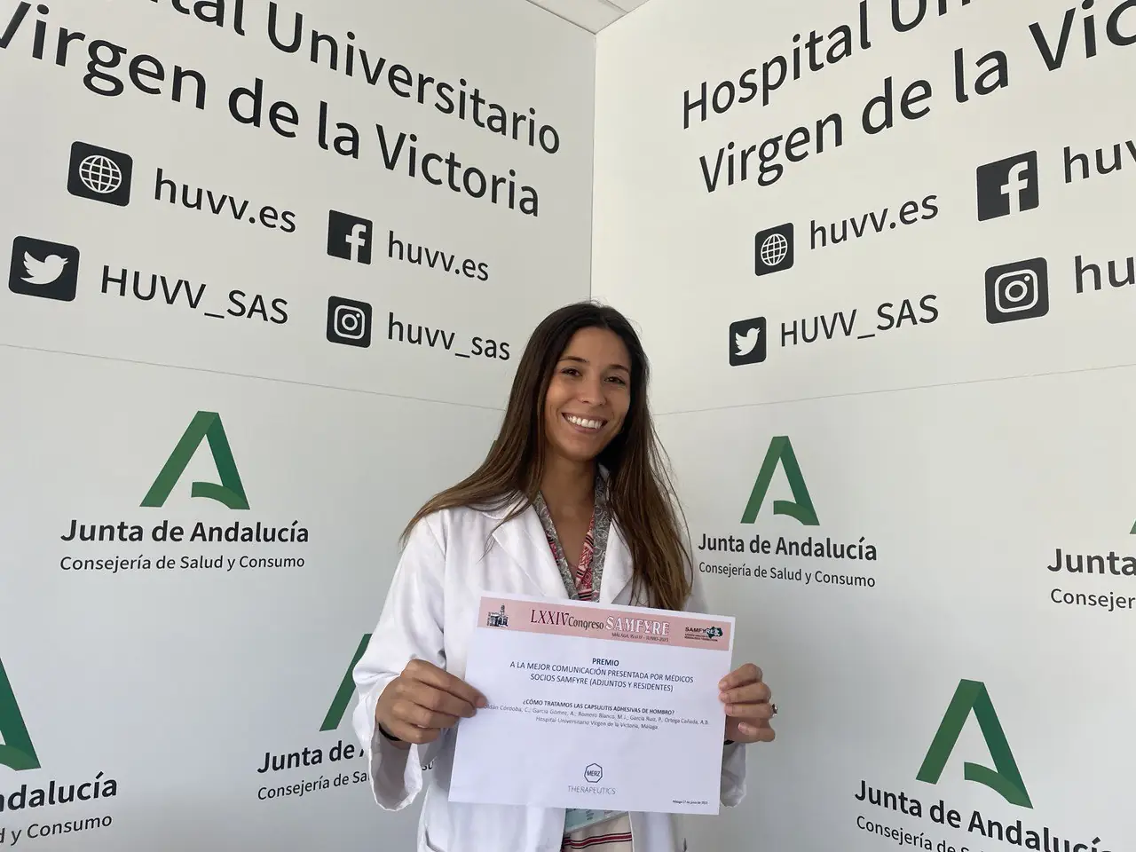 El Hospital Clínico Universitario Virgen de la Victoria de Málaga ha recibido por parte de la Sociedad de Medicina Física y Rehabilitación (SAMFYRE) el reconocimiento a un estudio que evalúa la efectividad y la seguridad de una técnica que está aplicando con éxito denominada Hidrodilatación Ecoguiada (HD),  que se utiliza para el tratamiento de la Capsulitis Adhesiva de Hombro como un procedimiento seguro  y eficaz  para reducir el dolor, mejorar la funcionalidad y conseguir una reincorporación laboral temprana a la persona afectada..