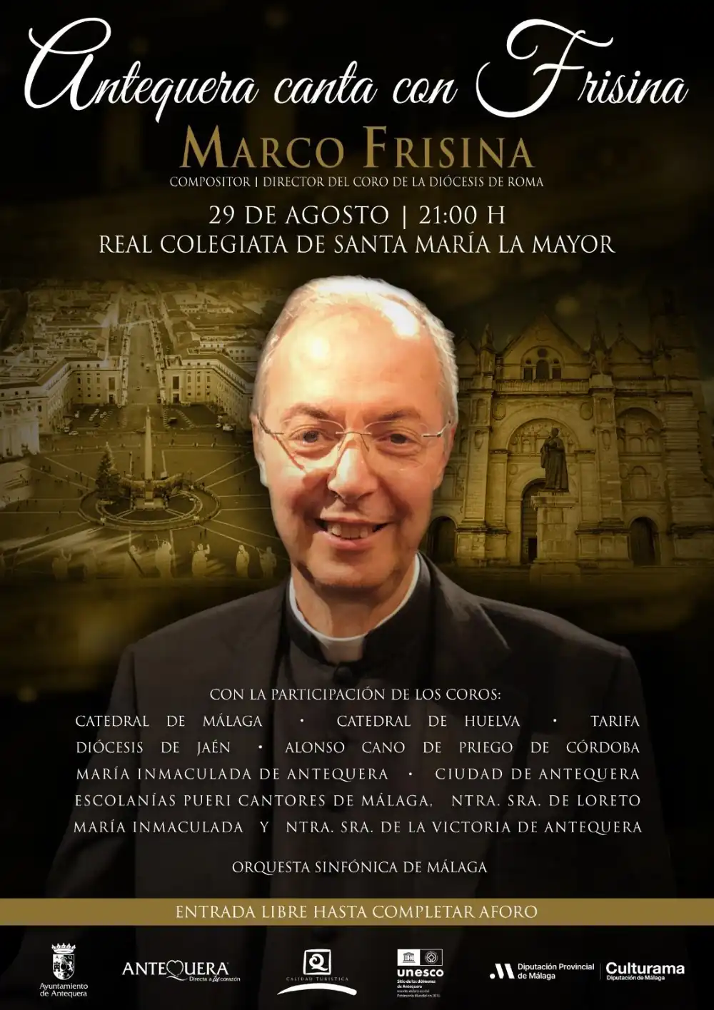 El compositor y director y del coro de la Diócesis de Roma, Marco Frisina, visita Antequera el próximo 29 de agosto donde dirigirá a casi una veintena de coros de toda Andalucía, 200 voces y a una Orquesta Sinfónica, para ofrecer un espectáculo de música sacra en la Real Colegiata Santa María La Mayor. La entrada será libre hasta completar aforo a partir de las 21:00 horas.