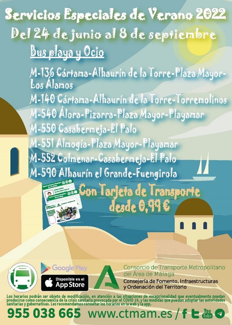Los Servicios Especiales de Bus Ocio y Playa establecidos van a mejorar la movilidad en transporte público de municipios y núcleos del interior (Alhaurín de la Torre, Álora, Almogía, Cártama, Casabermeja, Mijas y Pizarra) con las playas de Benalmádena, Torremolinos o Málaga, así como con centros comerciales y de ocio.