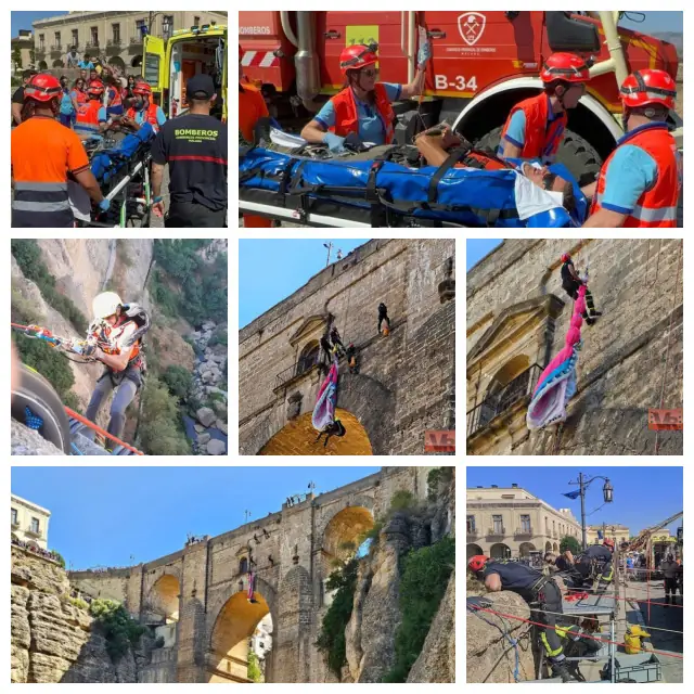 Efectivos del Consorcio Provincial de Bomberos (CPB) de la Diputación de Málaga han efectuado esta semana un simulacro del rescate de un parapentista que habría quedado enganchado en el Puente Nuevo de Ronda, a unos 80 metros de altura, al realizar una maniobra errónea.