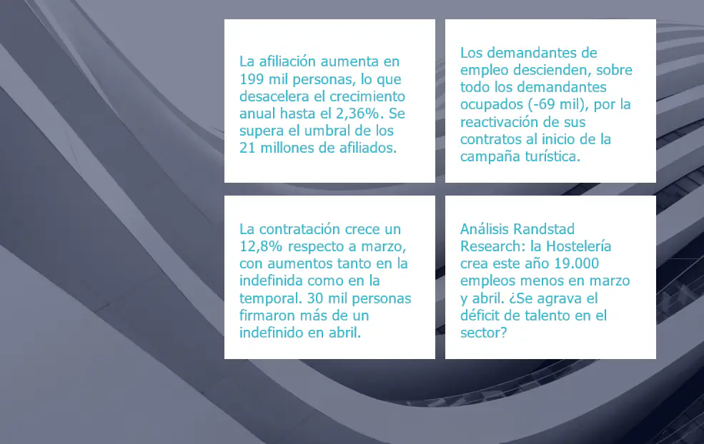 Crece la afiliación y disminuyen los demandantes de empleo en abril, por el gran impulso de la Hostelería. Se desacelera el crecimiento anual del empleo.