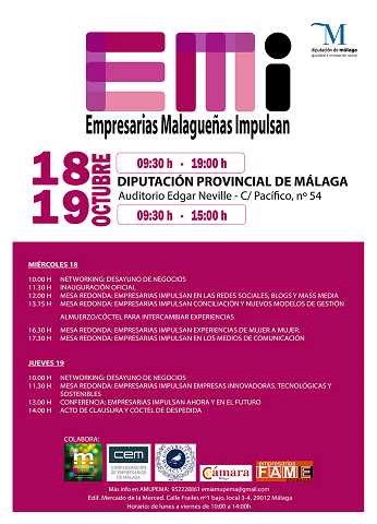 Las mesas redondas y charlas de EMI cubrirán distintos sectores y serán dirigidas por empresarias y profesionales de relevancia. El miércoles 18 a las 12.00 horas tendrá lugar la primera mesa en la que se tratarán las redes sociales, la segunda abordará la conciliación y los nuevos modelos de gestión a las 13.15 horas. En horario de tarde las mesas se centrarán en los medios de comunicación y en experiencias concretas de mujeres empresarias. La jornada del jueves 19 comenzará con un desayuno de negocios para dar paso posteriormente a una mesa sobre nuevas tecnologías y finalizará con una ponencia a cargo de una empresaria de reconocido prestigio a nivel nacional.