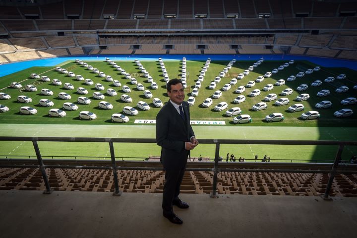 El presidente del Gobierno andaluz, Juanma Moreno, ha asistido en el Estadio de la Cartuja de Sevilla a la presentación de la nueva flota compuesta por 147 vehículos 100% eléctricos que la Junta de Andalucía ha adquirido y con los que se da un paso más en la Revolución Verde y se marca un nuevo hito en materia de sostenibilidad medioambiental y lucha contra el Cambio Climático.