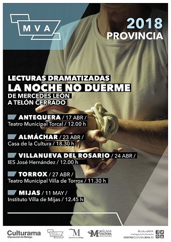 Culturama vuelve a contar con el grupo ‘A Telón Cerrado’ en distintos municipios de la provincia para una nueva lectura dramatizada. En esta ocasión, la obra elegida ha sido ‘La noche no duerme’, de Mercedes León, que se representará en Antequera (17 de abril a las 12.00 en el Teatro Municipal Torcal), Almáchar (23 de abril a las 18.30 en Casa de la Cultura), Villanueva del Rosario (24 de abril a las 12.00 en IES José Hernández), Torrox (27 de abril a las 11.30 en Teatro Municipal Villa de Torrox) y Mijas (11 de mayo a las 12.45 en Instituto Villa de Mijas). La edad recomendada para ver la obra es a partir de los 13 años y es una actividad hecha para realizarse en institutos con alumnado de bachillerato o en casas de cultura con adultos.
