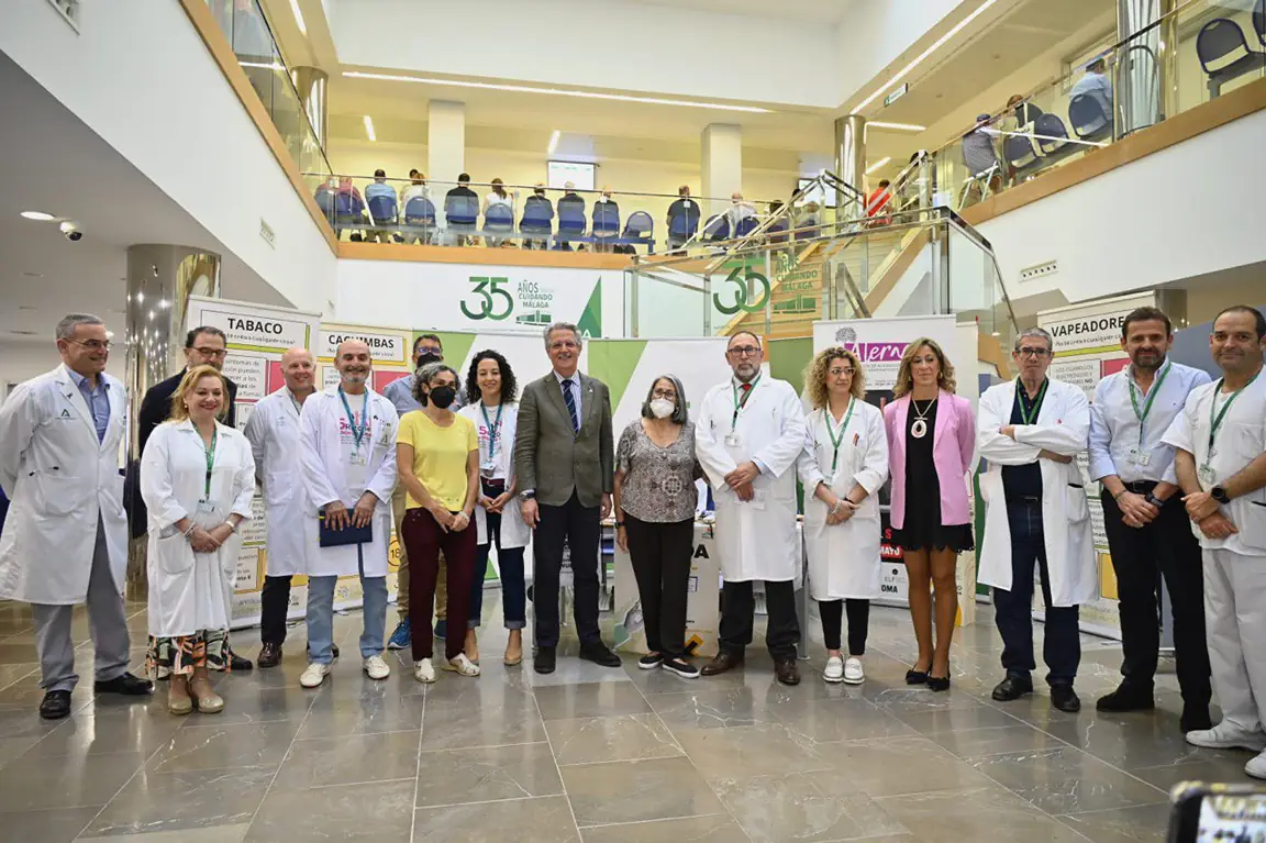 De este modo, la mesa informativa que se ha organizado en el entorno del Día Mundial sin Tabaco en el patio Azul de las consultas externas ha contado con la presencia del secretario general de Humanización, Planificación, Atención Sociosanitaria y Consumo, Javier Vázquez Granados, y el delegado territorial de Salud y Consumo, Carlos Bautista, a quien ha acompañado el director gerente del complejo hospitalario universitario Virgen de la Victoria, Jesús Fernández Galán, el director médico, Pedro Medina, el director de Enfermería, Pablo Fernández Plaza, la directora de gestión económica, Sonia Hernández, el jefe del servicio de Neumología, José Luis Velasco, y la especialista en Neumología y responsable de la unidad de Tabaquismo, la Dra. Eva Cabrera Cesar.