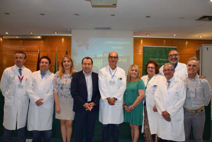 En rueda de prensa, el delegado del Gobierno andaluz en Málaga, José Luis Ruiz Espejo, acompañado de la delegada de Igualdad, Salud y Políticas Sociales, Ana Isabel González, del director gerente del Hospital Regional de Málaga, Emiliano Nuevo, así como del Coordinador del Sector Málaga de Trasplantes, Domingo Daga, la presidenta de Alcer Málaga, Josefa Gómez, y el resto de profesionales que han hecho posible alcanzar esta cifra, ha querido felicitar al centro por la efemérides.