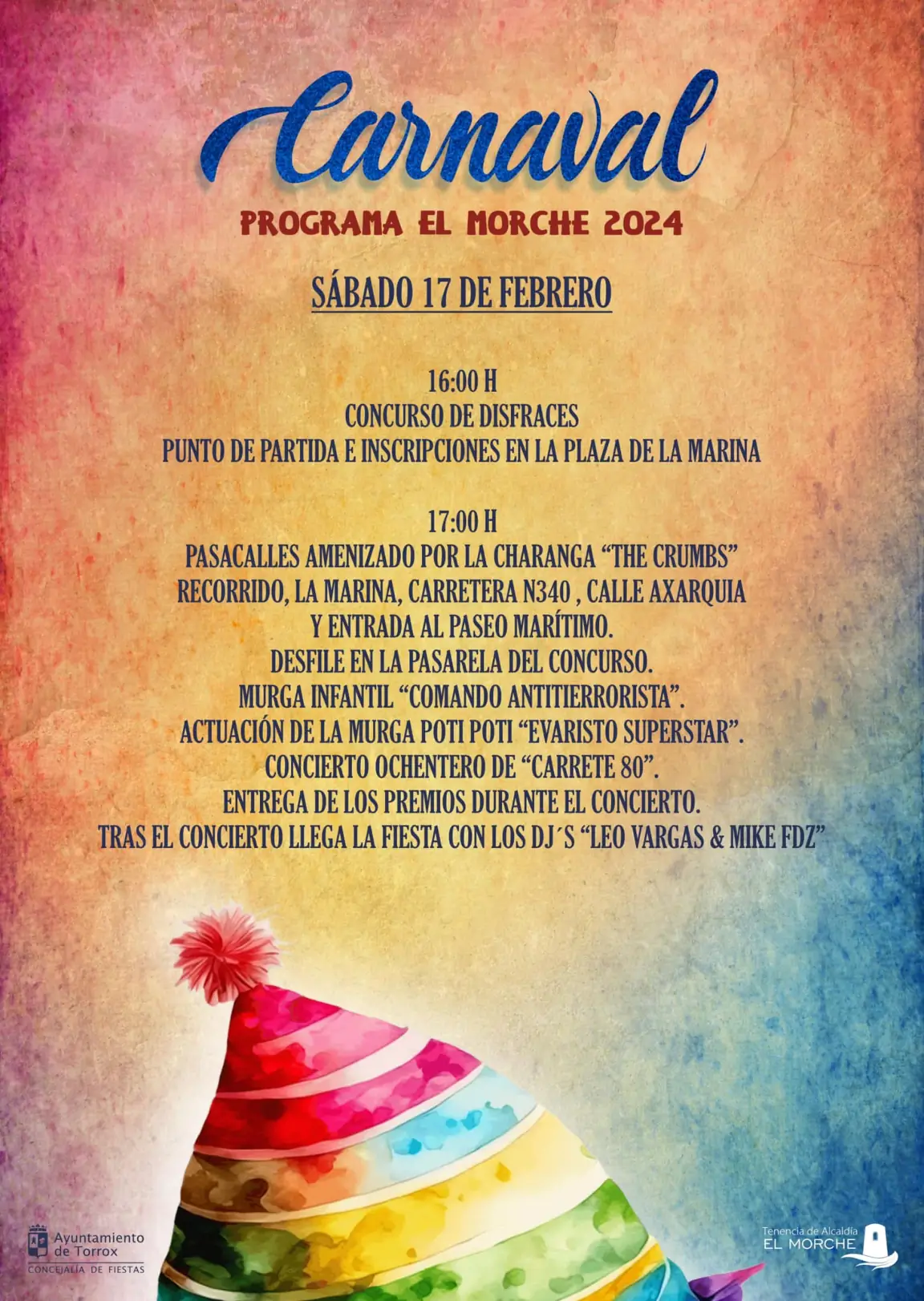 Torrox, 16 de enero de 2024.- El Morche celebra su Fiesta de Carnaval este sábado 17 de febrero a partir de las 16:00 horas, cuando se inician las inscripciones para el concurso de disfraces en la plaza de La Marina. El carnaval está organizado por la delegación de Tradiciones Populares del Ayuntamiento de Torrox junto a la concejalía de Fiestas y la Tenencia de Alcaldía de El Morche. Además del citado concurso, un pasacalles, desfile, actuaciones de murgas, un concierto y una fiesta final con DJs conforman el programa de actividades.