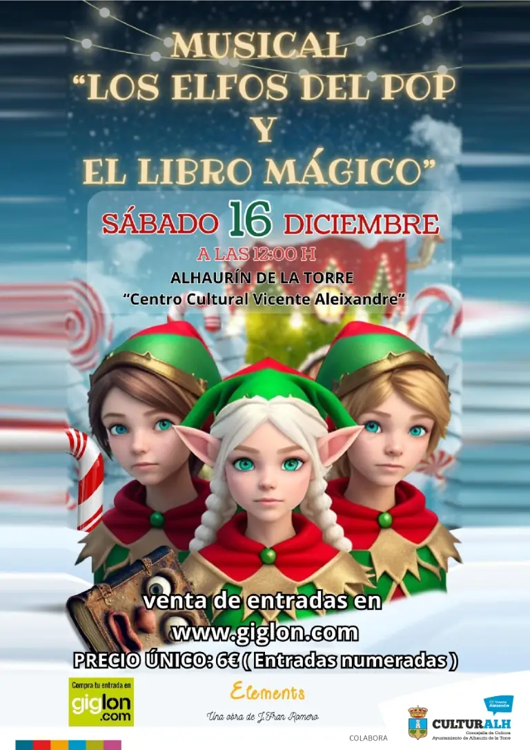 La Concejalía de Cultura del Ayuntamiento de Alhaurín de la Torre, que dirige Manuel López, ha comenzado a diseñar la programación para las próximas fiestas navideñas y los niños tendrán un papel fundamental en las mismas. Para ello, este área ha organizado para el sábado, 16 de diciembre, a las 12 horas en el Centro Cultural ‘Vicente Aleixandre’, la representación del musical infantil ‘Los elfos del pop y el libro mágico’. Una obra de Fran Romero que se podrá disfrutar por el precio de 6€ y cuyas entradas ya están a la venta en la web www.giglon.com.