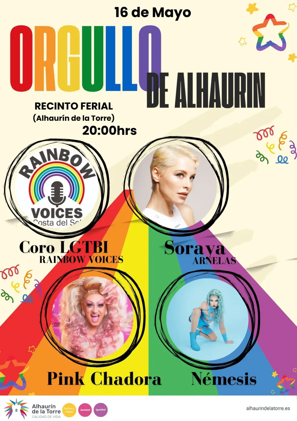 Alhaurín de la Torre se suma así de nuevo a las celebraciones por el Día Internacional contra la LGTBIfobia y por el Día del Orgullo LGTB, pero adelantando la cita de junio a mayo y tras la buena acogida de las ediciones anteriores. El edil delegado de Fiestas y Turismo, Andrés García, ha invitado a los vecinos a que acudan a disfrutar del evento y ha destacado el apoyo del Ayuntamiento a la “diversidad” y a la “libertad para amar y ser amado”.