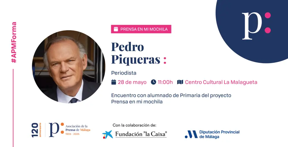 El Centro Cultural La Malagueta de la Diputación de Málaga recibirá el 28 de mayo al periodista Pedro Piqueras, que mantendrá un encuentro con un centenar de alumnos de Primaria en la clausura de la VII edición de Prensa en mi mochila, proyecto de alfabetización mediática de la Asociación de la Prensa de Málaga que cuenta con la colaboración de la Diputación, Fundación ”la Caixa” y CaixaBank.