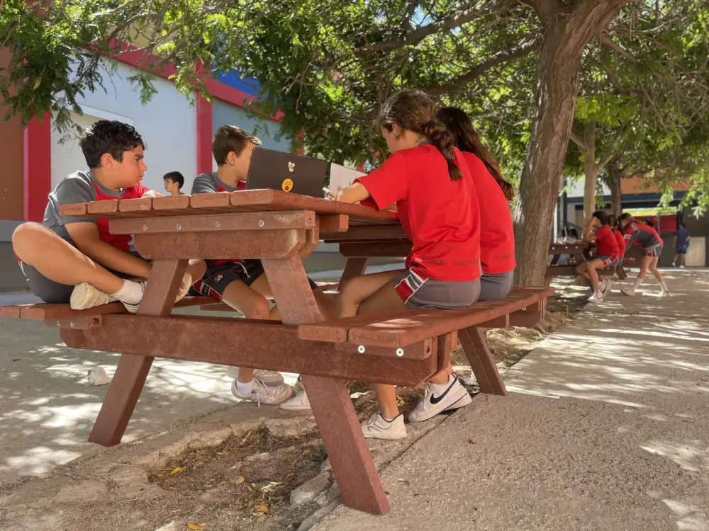 Las mesas y sillas emplazadas en los patios del centro durante este arranque de curso académico 24/25 son el resultado del proceso de reciclado de más de 750 kilogramos de botellas, envases y otros productos de desecho manufacturados por la empresa ‘SOLTECO’, especializada en la fabricación de este tipo de materiales, con acreditación y certificación de ‘NIVEL 1 de final de obra y trazabilidad con objetivo de logro medioambiental’