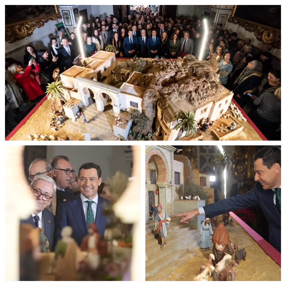 El presidente de la Junta, Juanma Moreno, ha inaugurado hoy el Belén del Palacio de San Telmo y ha agradecido la colaboración de la Asociación Belenista de Málaga ‘La Alcazaba’, una entidad presidida por Bernardo Herrera y que en 2024 cumple diez años de pasión, oficio y de artesanía.