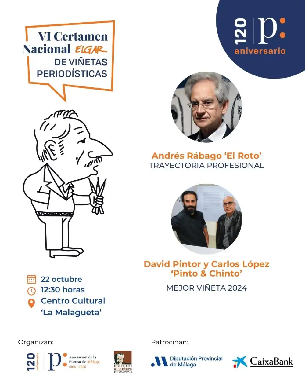 El próximo lunes, 22 de septiembre, el Centro Cultural La Malagueta de la Diputación acogerá el acto de entrega de premios del VI Certamen Nacional ‘Elgar’ de Viñetas Periodísticas, organizado por la Asociación de la Prensa de Málaga y la Fundación Manuel Alcántara con la colaboración de la Diputación Provincial y CaixaBank. En esta edición, el premio a la ‘Trayectoria profesional’ lo recibirá Andrés Rábago, conocido por los seudónimos de El Roto y OPS. En la modalidad ‘Mejor viñeta periodística’, el premio lo recibirán David Pintor y Carlos López, Pinto & Chinto, por su obra sobre el presidente ruso Vladímir Putin y la guerra en Ucrania, publicada en la sección Opinión del diario La Voz de Galicia el 28 de febrero de 2024.