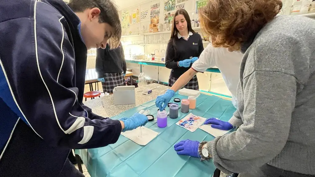 Por otro lado, y a través de esta actividad formativa-divulgativa que lleva a cabo el servicio de Anatomía Patológica del Hospital Clínico de Málaga, también se llevaron a cabo tinciones rápidas con Diff-Quik sobre extendidos citológicos, que ellos mismos obtuvieron de su mucosa oral, para posteriormente visualizarlos al microscopio óptico, dotado de multicabezal para explicación simultánea por parte de las patólogas de las características de las células que estaban observando en este momento.