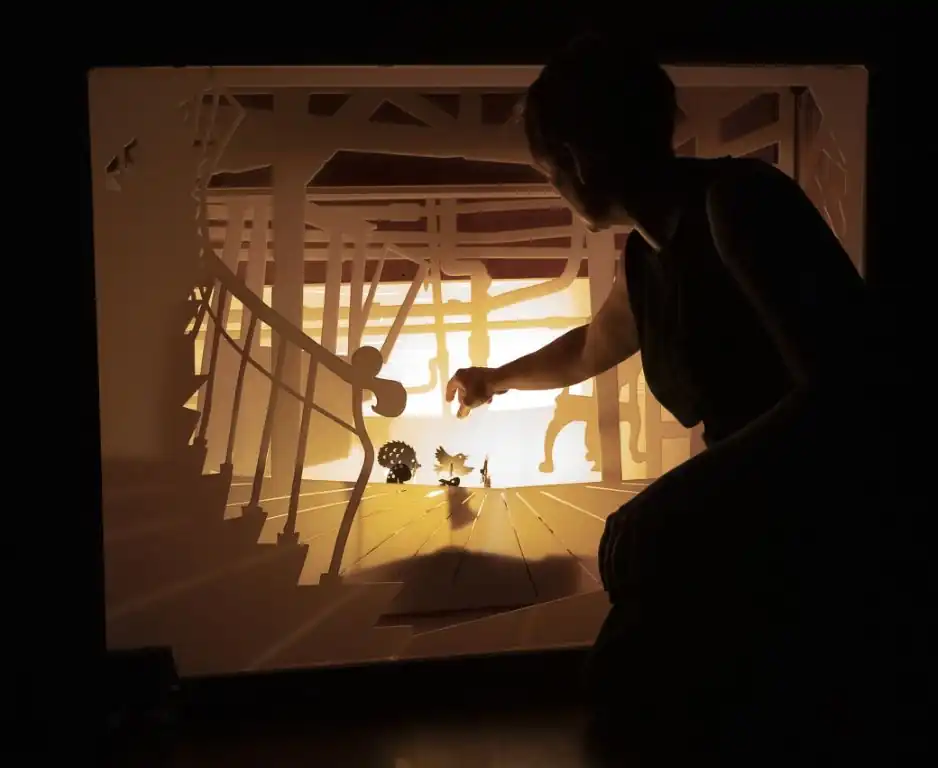 ‘Lua’ es un viaje de la luz hacia la oscuridad donde una escalera de madera cobra vida componiendo espacios de gran belleza a cada paso que dan los personajes Lua y Sombra. De la escalera se abren puertas y ventanas que esconden toda una ciudad en miniatura. Casas de todo tipo y tamaños se reparten por sus escalones, creando un entramado de luces, de vida.