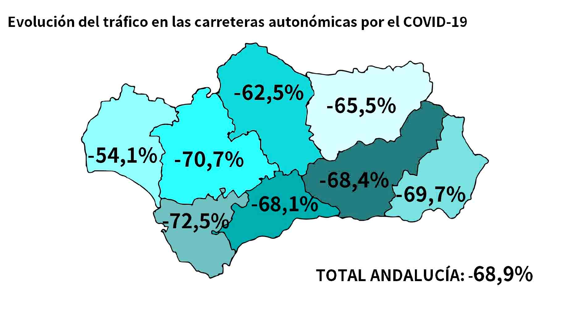Esta reducción del tráfico se ha producido como consecuencia de la Orden de 14 de marzo de 2020, por la que se adoptaron medidas preventivas de salud pública en la Comunidad Autónoma de Andalucía como consecuencia de la situación y evolución del coronavirus (Covid-19). Así, se ha limitado la movilidad no obligada de los ciudadanos, sin merma de aquella que resulte imprescindible para permitir a los ciudadanos acceder a sus puestos de trabajo y realizar las funciones básicas. Además, para evitar el contacto entre los usuarios, se han reducido los servicios de los modos de transporte de titularidad autonómica como los autobuses o los metros andaluces (de Sevilla, Málaga y Granada).