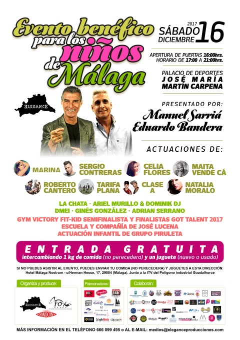 Málaga – La empresa Elegance Producciones, Fox Group y Sonocón, con el apoyo de las principales instituciones y empresas de Málaga, organiza el próximo día 16 de 17h a 21h, en el Palacio de Deportes Martín Carpena, la tercera Gala de ocio, arte y cultura para la infancia malagueña. Este evento cuenta con la colaboración especial del Ayuntamiento de Málaga, de la policía municipal de Málaga y del Real Cuerpo de Bomberos de nuestra ciudad. La Gala tiene un doble objetivo. Por un lado, favorecer la asistencia a un espectáculo de primer nivel a niños y niñas de familias humildes de nuestra ciudad, que difícilmente pueden permitirse asistir a este tipo de eventos. Por otro, recoger de forma masiva alimentos y juguetes para ser repartidos -el día de los Reyes Magos- entre familias humildes beneficiarias de varias asociaciones de Málaga. Entre las dos ediciones anteriores se han recogido más de 7.000kg de comidas y 8.000 juguetes, gracias a la solidaridad de toda la ciudadanía malagueña.