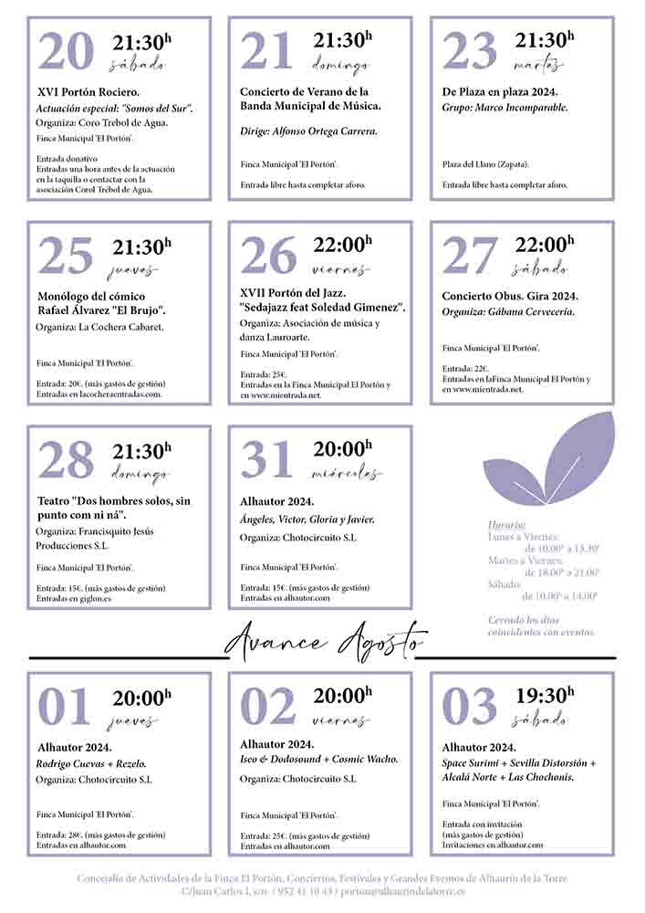 Finca El Portón, ubicada en Calle Juan Carlos I, Alhaurín de la Torre, Málaga, presenta una emocionante agenda de eventos culturales para el mes de julio de 2024. Desde conciertos de jazz hasta monólogos, hay algo para todos los amantes del arte y la música.