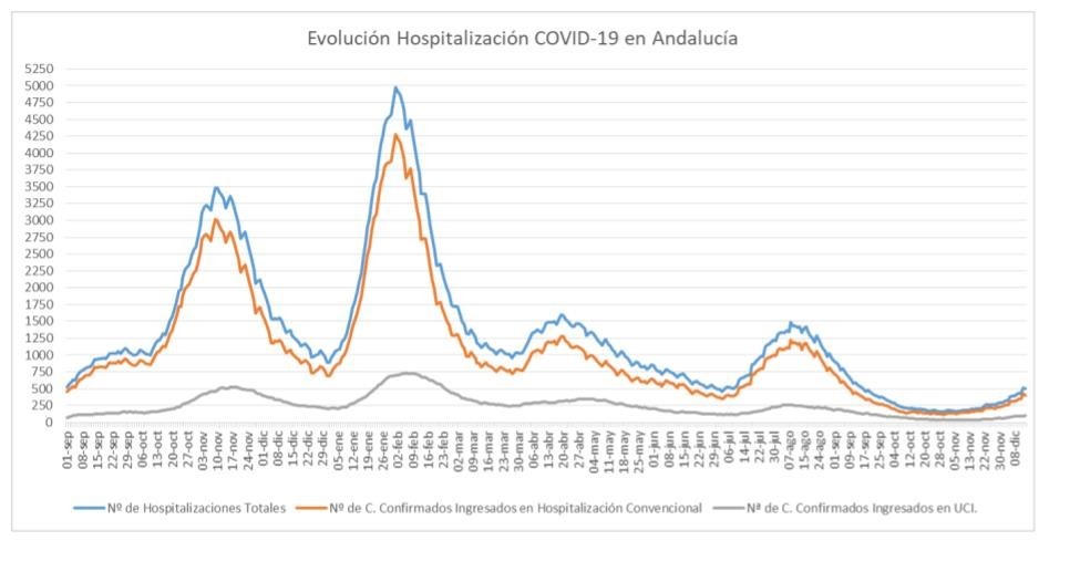 Por provincias: en Almería (30 hospitalizaciones, de las que 9 en UCI), Cádiz (45 hospitalizaciones, de las que 6 en UCI), Córdoba (63 hospitalizaciones, de las que 17 en UCI), Granada (46 hospitalizaciones, de las que 10 en UCI), Huelva (33 hospitalizaciones, de las que 5 en UCI), Jaén (28 hospitalizaciones, de las que 7 en UCI), Málaga (148 hospitalizaciones, de las que 24 en UCI) y Sevilla (110 hospitalizaciones, de las que 19 en UCI).