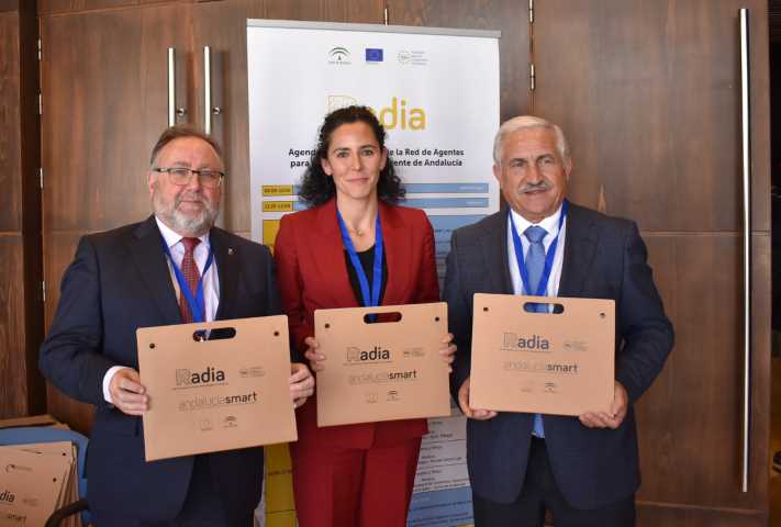 El vicepresidente de la Federación Andaluza de Municipios y Provincias (FAMP) y alcalde de Alhaurín de la Torre, Joaquín Villanova Rueda; la directora general de Economía Digital e Innovación de la Consejería de Economía, Conocimiento, Empresas y Universidad de la Junta de Andalucía, Loreto del Valle Cebada y el delegado del Área de Sostenibilidad y Medio Ambiente del Ayuntamiento de Málaga, José del Río, han participado hoy en la inauguración de la jornada “Lanzamiento de la Red de Agentes para las Ciudades Inteligentes de Andalucía (RADIA)”, en el marco del X Foro de Inteligencia y Sostenibilidad Urbana Greencities 2019 que se celebra en Málaga.