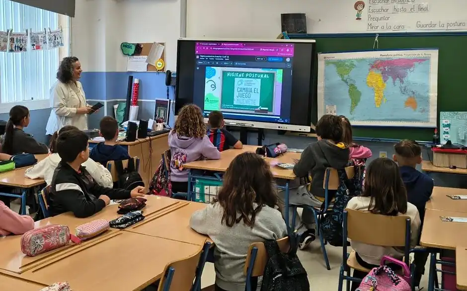 Profesionales de fisioterapia del Distrito de Atención Primaria Málaga-Valle del Guadalhorce han llevado a cabo talleres de higiene postural en diversos centros educativos. La actividad está dirigida a alumnado de 3º y 4º de Educación Primaria en una iniciativa basada en la campaña “Cambia el juego, muévete”, impulsada por el Colegio de Fisioterapeutas de Andalucía y que se ha organizado en colaboración con las enfermeras referentes escolares.
