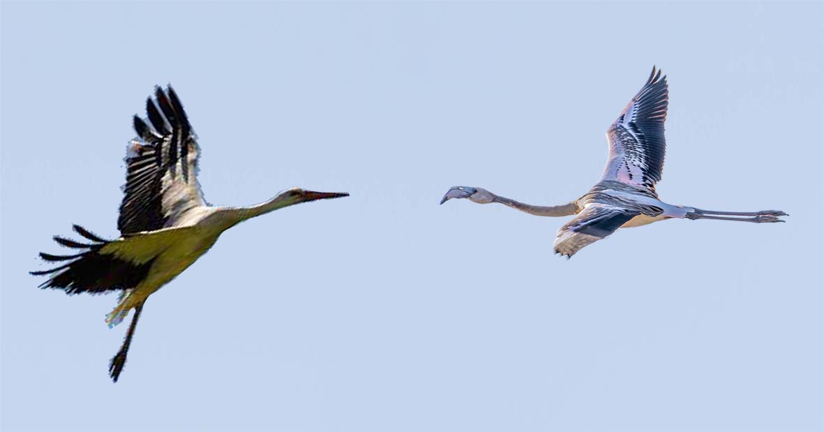 Ambas especies se distribuyen por Europa, África y Asia y pueden recorrer largas distancias al día, entre 400 km las cigüeñas y hasta 600 km los flamencos, pero unas son más visibles porque los hacen sobre tierra, ya que las térmicas no se producen sobre el mar y, por tanto, tienen que cruzar, aquí en occidente, por el Estrecho de Gibraltar (en oriente es por el Bósforo), y los otros son capaces de atravesar el Mediterráneo en sus vuelos.