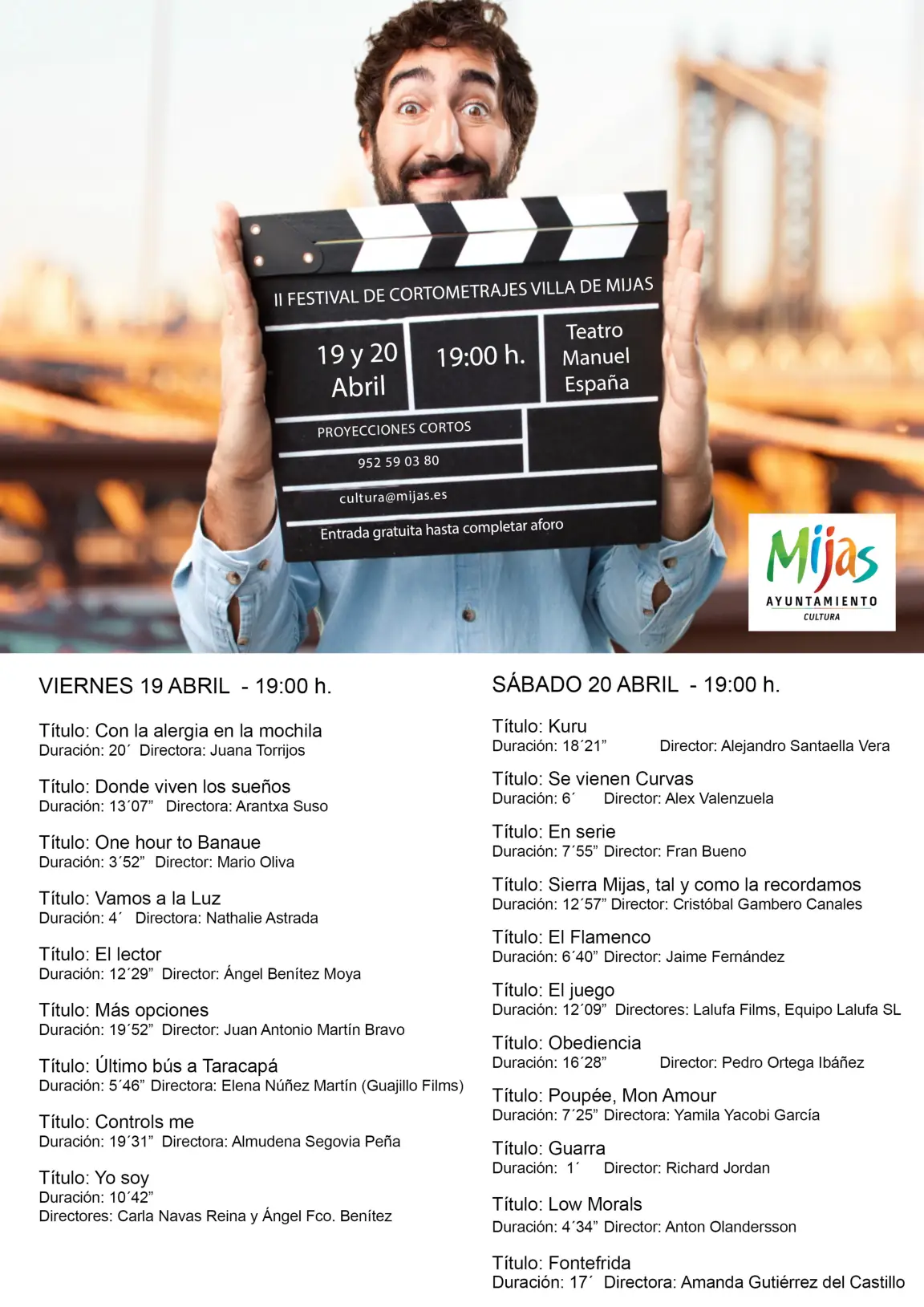 Las proyecciones se llevarán a cabo el viernes 19 y sábado 20 de abril del año 2024. Los cortometrajes han sido grabados en Mijas y/o por directores mijeños, reflejando la rica cultura y talento cinematográfico local. Las proyecciones comenzarán a las 19:00 h ambos días, con entrada gratuita hasta completar aforo.