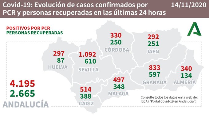 Por otro lado, se han notificado dos nuevos brotes en residencias: en la Residencia FOAM de Guadix (Granada) con 23 casos confirmados (20 residentes y 3 trabajadores) y en la Residencia La Alameda de Carmona (Sevilla) con 14 positivos (11 residentes y 3 trabajadores).