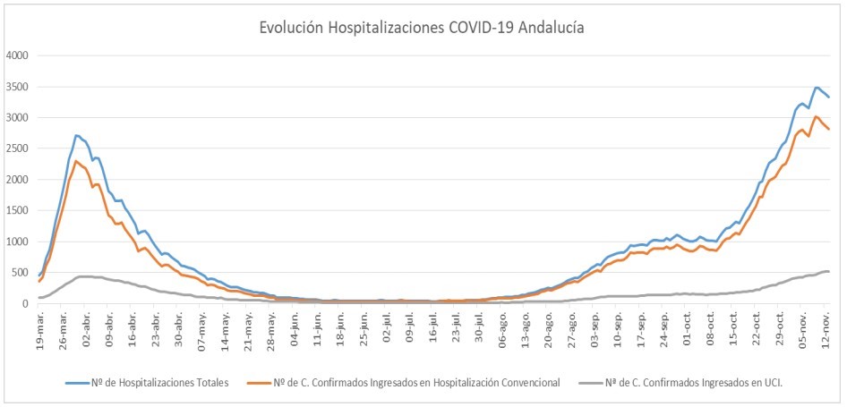 Por provincias: en Almería (122 hospitalizaciones, de los que 33 en UCI), Cádiz (364 hospitalizaciones, de los que 50 en UCI), Córdoba (328 hospitalizaciones, de los que 48 en UCI), Granada (803 hospitalizaciones, de los que 130 en UCI), Huelva (153 hospitalizaciones, de los que 15 en UCI), Jaén (347 hospitalizaciones, de los que 51 en UCI), Málaga (390 hospitalizaciones, de los que 59 en UCI) y Sevilla (822 hospitalizaciones, de los que 131 en UCI).