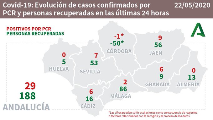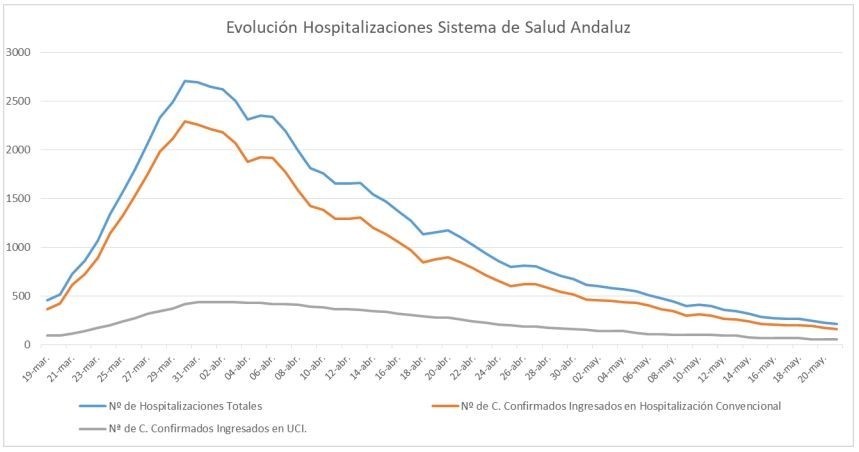 Por provincias: en Almería (13 hospitalizaciones de los que 2 en UCI), Cádiz (24 hospitalizaciones de los que 7 en UCI), Córdoba (25 hospitalizaciones de los que 10 en UCI), Granada (37 hospitalizaciones de los que 6 en UCI), Huelva (4 hospitalizaciones de los que 3 en UCI), Jaén (33 hospitalizaciones de los que 10 en UCI), Málaga (45 hospitalizaciones de los que 6 en UCI) y Sevilla (31 hospitalizaciones de los que 8 en UCI).
