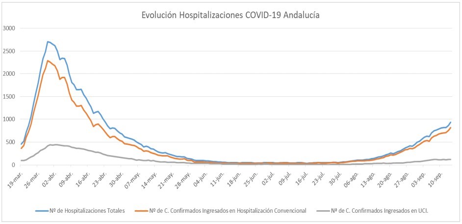 La Consejería de Salud y Familias informa de que, actualmente, 938 pacientes confirmados con COVID-19 permanecen ingresados en los hospitales andaluces, de los que 120 se encuentran en UCI.